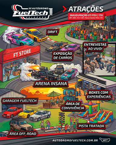 AdesivagemAr CondicionadoAuto ElétricasAuto EscolasAuto MecânicasAuto PeçasAuto PostosAuto VidrosChaveirosCorretoras de SeguroDespachantesEscapamentosFerro VelhoFunilaria e PinturaGuinchoInsulfilmLavagem e PolimentoLocadorasMartelinho de OuroMoto PeçasRadiadoresRecuperadorasRodas, Pneus e CiaSom e AcessóriosTapeçariaTáxiVelocimetrosVistoria e InspeçãoExposição de 1.000 carros antigos e customizados, show de drift, manobras radicais e área off-road: uma programação irada vai marcar a inauguração do Autódromo FuelTech Velopark no dia 7 de fevereiro em Nova Santa Rita (RS). Pensado para toda a família, o evento ocorrerá das 17 horas à meia-noite, em clima de festival automotivo, com direito à pista iluminada, motores roncando e muita música, contando ainda com a participação de diversas celebridades do mundo automotivo. Os ingressos são limitados e devem ser adquiridos antecipadamente por meio do site www.autodromofueltech.com.br. A expectativa é atrair um público aproximado de 15 mil pessoas.