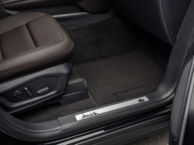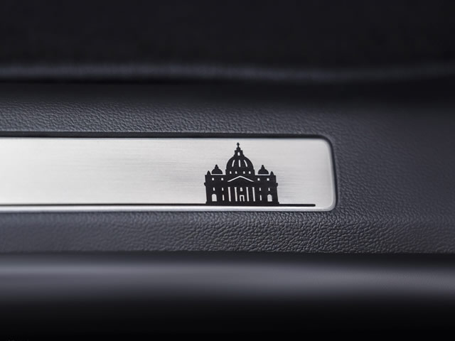 O interior também traz detalhes únicos, incluindo etiquetas com a bandeira de Chicago nos bancos de couro, o skyline da cidade bordado no console central e um sistema de áudio capaz de sintonizar estações de rádio europeias. As soleiras exibem os skylines de Chicago e da Basílica de São Pedro, representando a jornada do Papa ao Vaticano.