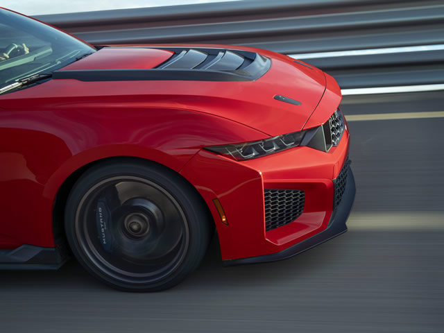 A resistência na pista foi um objetivo principal no desenvolvimento do Mustang Dark Horse SC. A equipe de design trabalhou para gerenciar o arrefecimento e a função aerodinâmica refinando a forma icônica do Mustang. A nova dianteira contribui para o arrefecimento do freio. O novo capô de alumínio, com travas de série e grande saída de ar, melhora o arrefecimento do trem de força e ajuda na aerodinâmica. A remoção da bandeja de chuva da saída de ar do capô aumenta o downforce e cria uma área aberta cinco vezes maior.