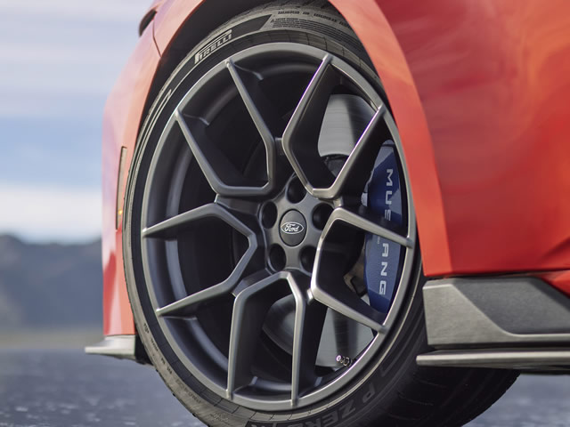 O pacote opcional para pista (Track Pack) eleva ainda mais o desempenho dinâmico do Dark Horse SC. Ele inclui uma calibração especial da suspensão MagneRide, adaptada às rodas de fibra de carbono, e pneus Pilot Sport Cup 2 R personalizados, que a Ford Racing desenvolveu em parceria com a Michelin. Medindo 305/30R20 na frente e 315/30R20 na traseira, eles utilizam tecnologia do Mustang GTD para entregar níveis de tração próximos aos de um supercarro.