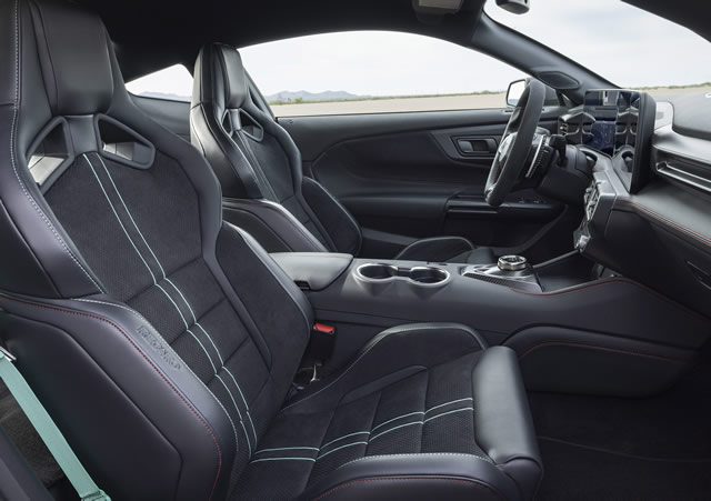 No cockpit, o Dark Horse SC exibe o volante de base chata revestido em couro do Mustang GTD, com controles de performance e detalhes em Alcantara e fibra de carbono. Bancos esportivos opcionais Recaro em couro e Dinamica – material ecológico premium – estão inclusos no Track Pack, com detalhes em cinza ou azul-esverdeado (Teal) e uma tampa no lugar dos bancos traseiros.