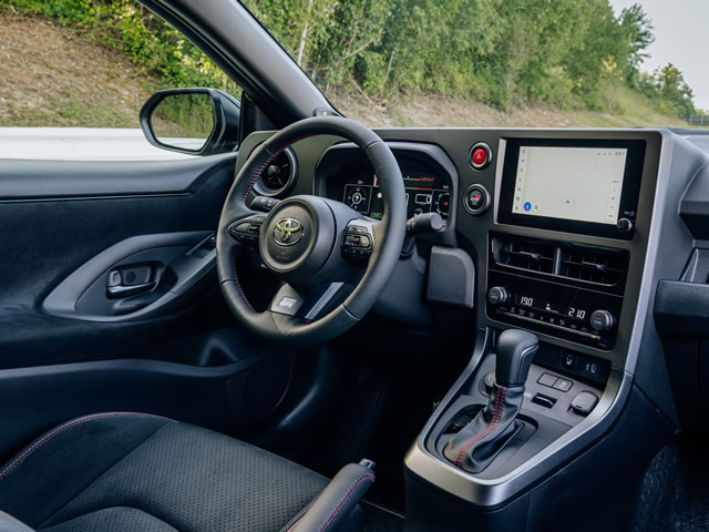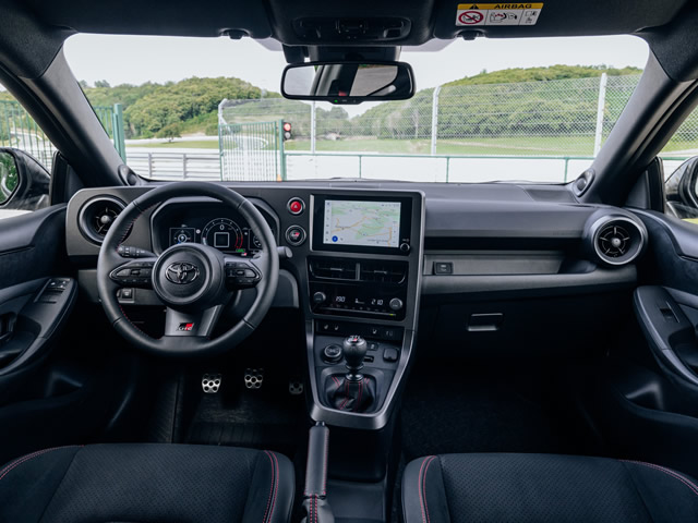Toda a cabine do novo GR Yaris é exclusiva e foi desenvolvida sob o conceito driver-first, que prioriza a experiência do condutor. Com inspiração nos veículos de competições de rali, o console central é inclinado em 15° para melhorar a visibilidade e há espaço para a instalação de mostradores ou de um monitor para copiloto à frente do passageiro.