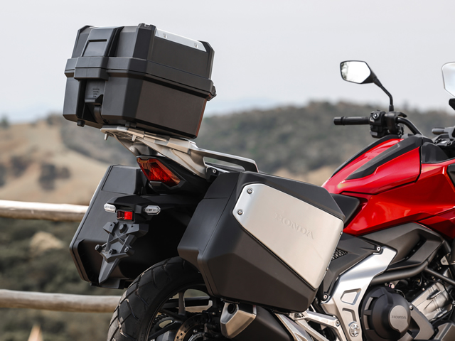 O exclusivo compartimento frontal para capacete da NC750X, localizado onde fica o tanque de combustível nas motos convencionais, tem capacidade para 23 litros podendo abrigar um capacete e pequenos objetos. Tal compartimento dispõe de porta USB-C, posicionada no canto superior esquerdo, e uma divisória que permite melhor organização do espaço de carga.