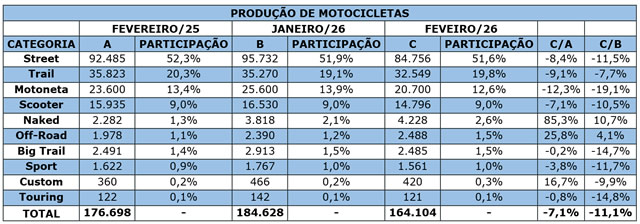 Em fevereiro, foram produzidas 164.104 motocicletas, volume 7,1% menor ao registrado no mesmo mês do ano passado e 11,1% inferior ao alcançado em janeiro. "A retração já era prevista, em razão do feriado de Carnaval, que reduziu o número de dias úteis do mês e impactou o ritmo de produção", explica Bento.