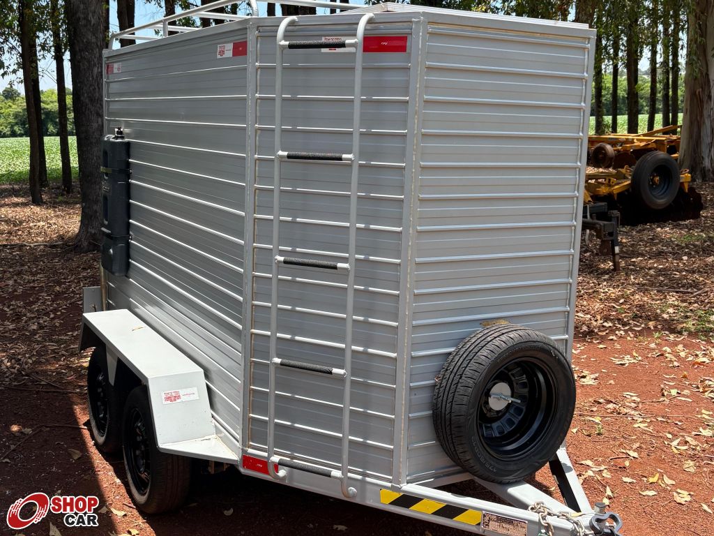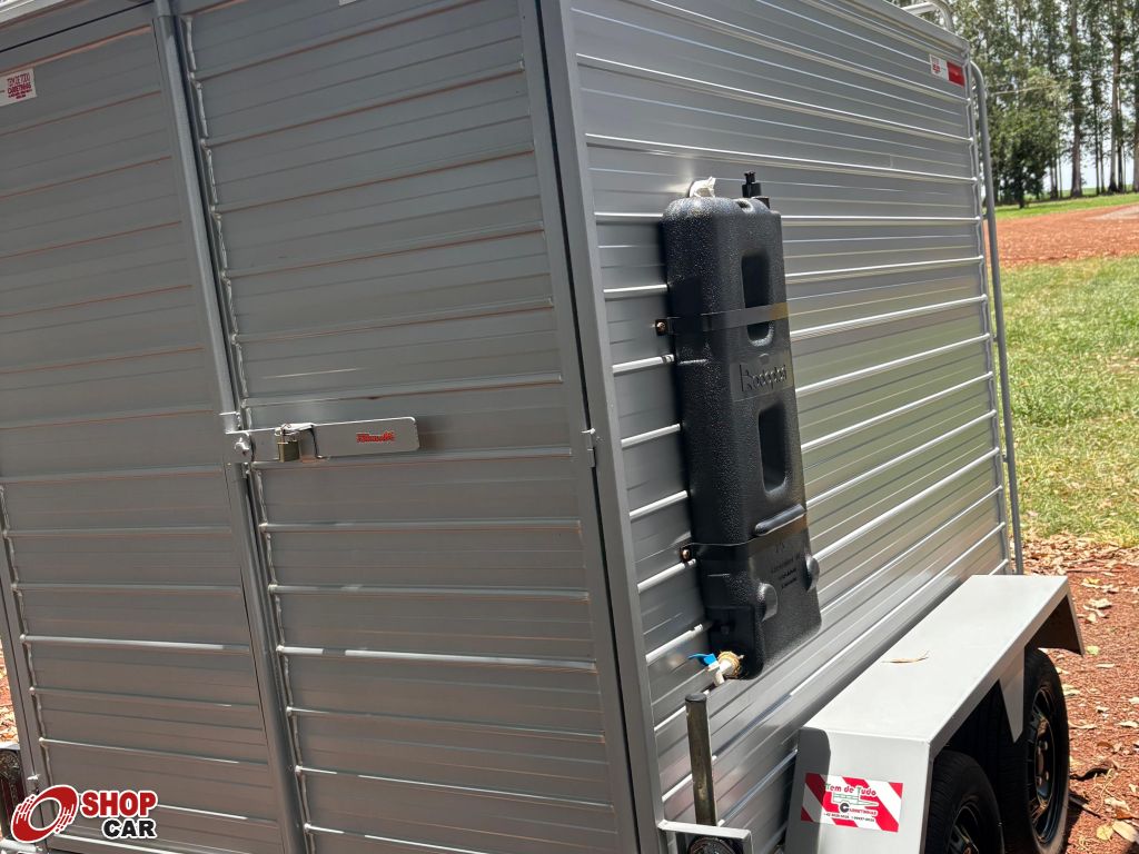 Descrição do veículo:Reboque fechado, compensado naval, vaga para 2 motos, estepe, placa solar, bateria, conversor, reservatório de agua.