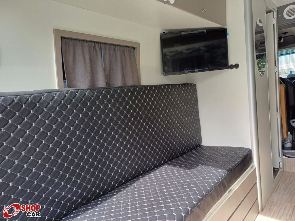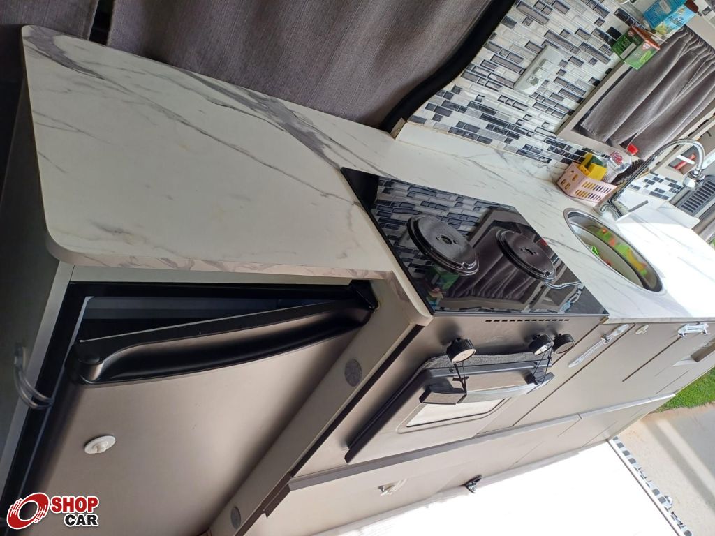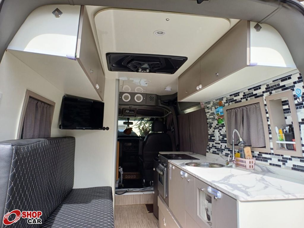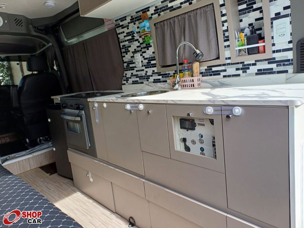 Mais opcionais:Carroceria com isolamento térmico, piso vinílico, poltronas giratórias, TV 24". fogão cooktop, refrigerador, microondas, acabamento em fibra, aquecimento a gás e elétrico, cama casal, ar condicionado, tanques de 186L (limpa) e 120L (servida), placas, toldo elétrico, máquina para lavar de 3,5kg, iluminação LED, antena de TV.